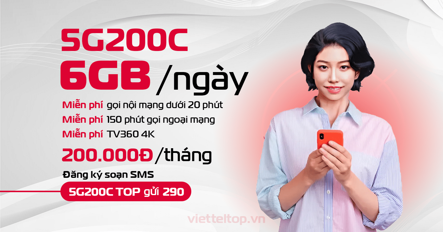 Bạn đang tìm kiếm gói cước 5G Viettel dung lượng lớn, tốc độ cao, kèm ưu đãi gọi và giải trí? 5G200C chính là lựa chọn hoàn hảo với giá chỉ hơn 200.000đ/tháng, nhận ngay 180GB (6GB/ngày), miễn phí gọi nội mạng và xem TV360 Basic 4K trên màn hình nhỏ.