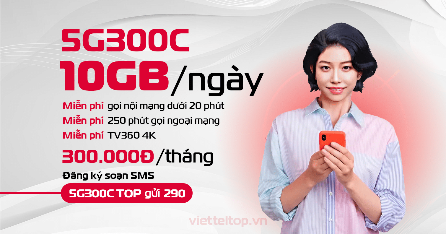 Bạn đang tìm một gói cước 4G/5G Viettel dung lượng “khủng”, gọi nội – ngoại mạng thoải mái và xem TV360 4K miễn phí? Gói 5G300C của Viettel chính là lựa chọn lý tưởng với giá chỉ 300.000đ/tháng, bạn nhận ngay 300GB data tốc độ cao (10GB/ngày) cùng hàng loạt ưu đãi vượt trội.