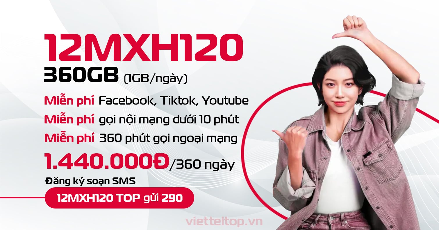 Bạn là người trẻ, luôn muốn kết nối với bạn bè, xem video TikTok, lướt Facebook hay nhắn tin Messenger mà không lo hết dung lượng? Bạn muốn tiết kiệm chi phí nhưng vẫn có gói cước ổn định cả năm? Gói 12MXH120 Viettel chính là lựa chọn hoàn hảo cho bạn! Với 1.440.000 VND cho 360 ngày, tương đương chỉ 120.000 VND/tháng, bạn sẽ nhận ngay 360GB data tốc độ cao, miễn phí gọi nội mạng dưới 10 phút, 360 phút ngoại mạng, và truy cập không giới hạn TikTok, YouTube, Facebook, Messenger.