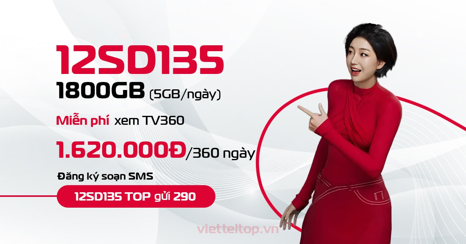 12SD135 Viettel là lựa chọn tối ưu cho những ai cần sử dụng data tốc độ cao liên tục trong suốt 12 tháng mà vẫn tiết kiệm chi phí. Với 1.800GB data, miễn phí TV360 Basic và nhiều kênh đăng ký tiện lợi, đây là gói cước rất đáng để bạn cân nhắc cho nhu cầu sử dụng Internet ổn định, mượt mà mỗi ngày.