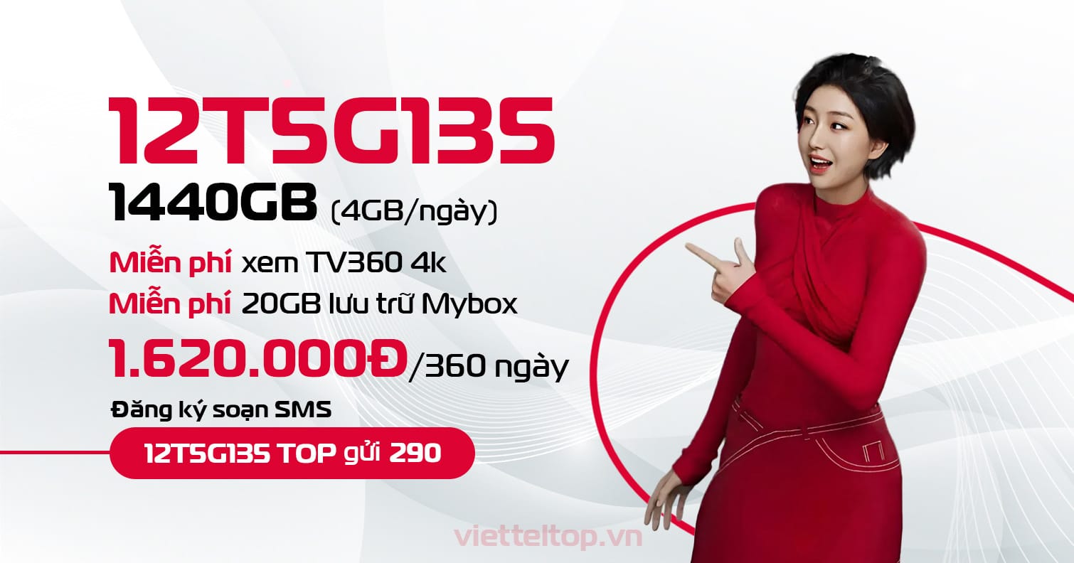 Đăng ký 12T5G135, bạn chỉ trả 1.620.000 đồng cho 12 tháng, tương đương 135.000 đồng mỗi tháng. Thuê bao sẽ nhận 1.440GB data tốc độ cao (4GB/ngày) và được miễn phí xem TV360 trên màn hình nhỏ. Đây là mức ưu đãi rất cạnh tranh so với các gói cước cùng phân khúc.