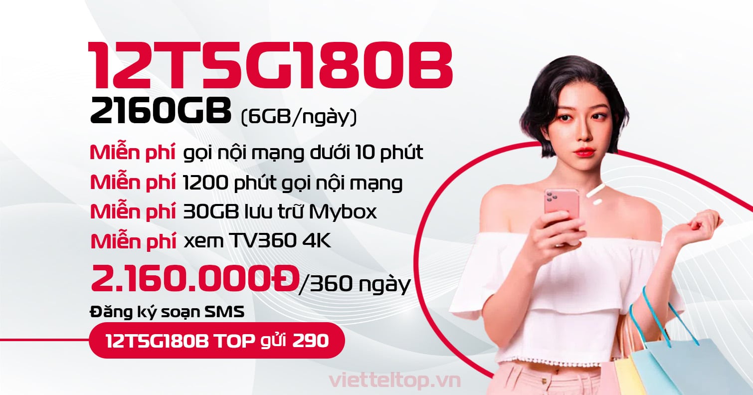 Gói 12T5G180B là sản phẩm mới được Viettel triển khai dành cho thuê bao di động trả trước. Chỉ với 2.160.000đ/360 ngày, bạn sở hữu 2160GB data 5G – tương đương 6GB/ngày – đủ để truy cập mạng, xem video, đọc báo, lướt mạng xã hội hay làm việc trực tuyến một cách mượt mà suốt cả năm. Đây là lượng data lớn, phù hợp với người dùng có nhu cầu internet cao nhưng vẫn muốn tiết kiệm chi phí.