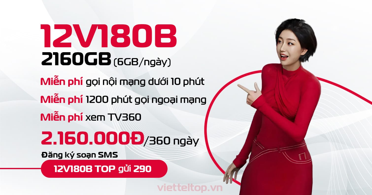 12V180B là gói combo 12 tháng của Viettel với mức phí trọn gói 2.160.000 đồng, tương ứng 180.000 đồng cho mỗi tháng sử dụng. Sau khi đăng ký, thuê bao được cung cấp 6GB data tốc độ cao mỗi ngày, tổng cộng 2.160GB trong suốt chu kỳ 360 ngày. Cùng với đó là ưu đãi miễn phí các cuộc gọi nội mạng có thời lượng dưới 10 phút và 1.200 phút gọi ngoại mạng trong một năm.