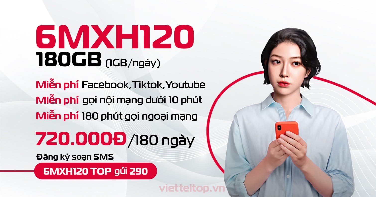 Bạn là người sử dụng mạng di động trả trước Viettel và thường xuyên cần kết nối internet để phục vụ công việc, học tập, lướt mạng xã hội? Gói 6MXH120 Viettel chính là lựa chọn hoàn hảo giúp bạn tận hưởng data tốc độ cao và ưu đãi gọi thoại trong suốt 180 ngày.