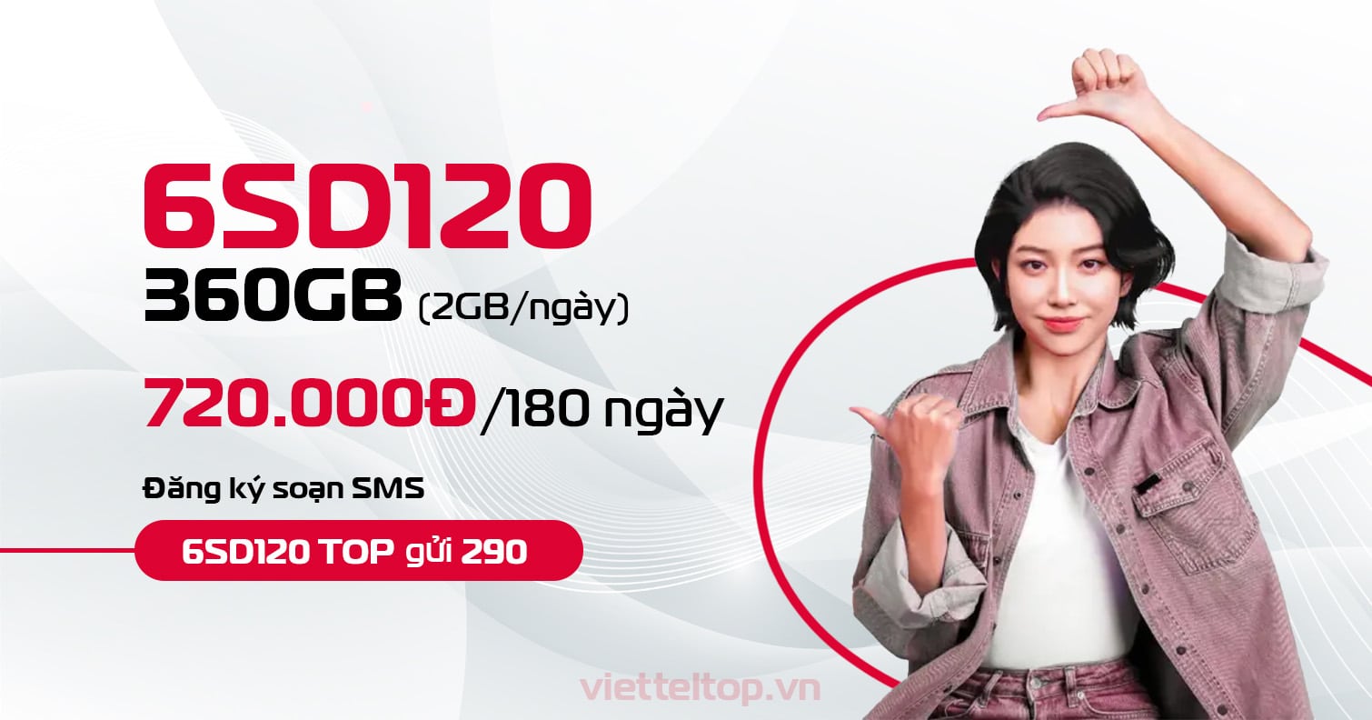 6SD120 là gói cước data dài hạn mới của Viettel, cho phép người dùng trả trước đăng ký sử dụng 6 tháng chỉ với mức chi phí tương đương 120.000 đồng/tháng. Với tổng giá trị 720.000 đồng cho 180 ngày sử dụng, khách hàng nhận được tổng cộng 360GB data 4G tốc độ cao, chia theo mức 2GB mỗi ngày.