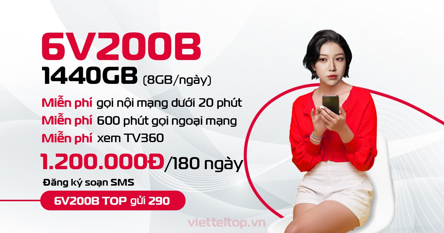 | 6V200B | 1.200.000đ | Đăng ký | 1.440GB data + miễn phí nội mạng + 600 phút ngoại mạng |