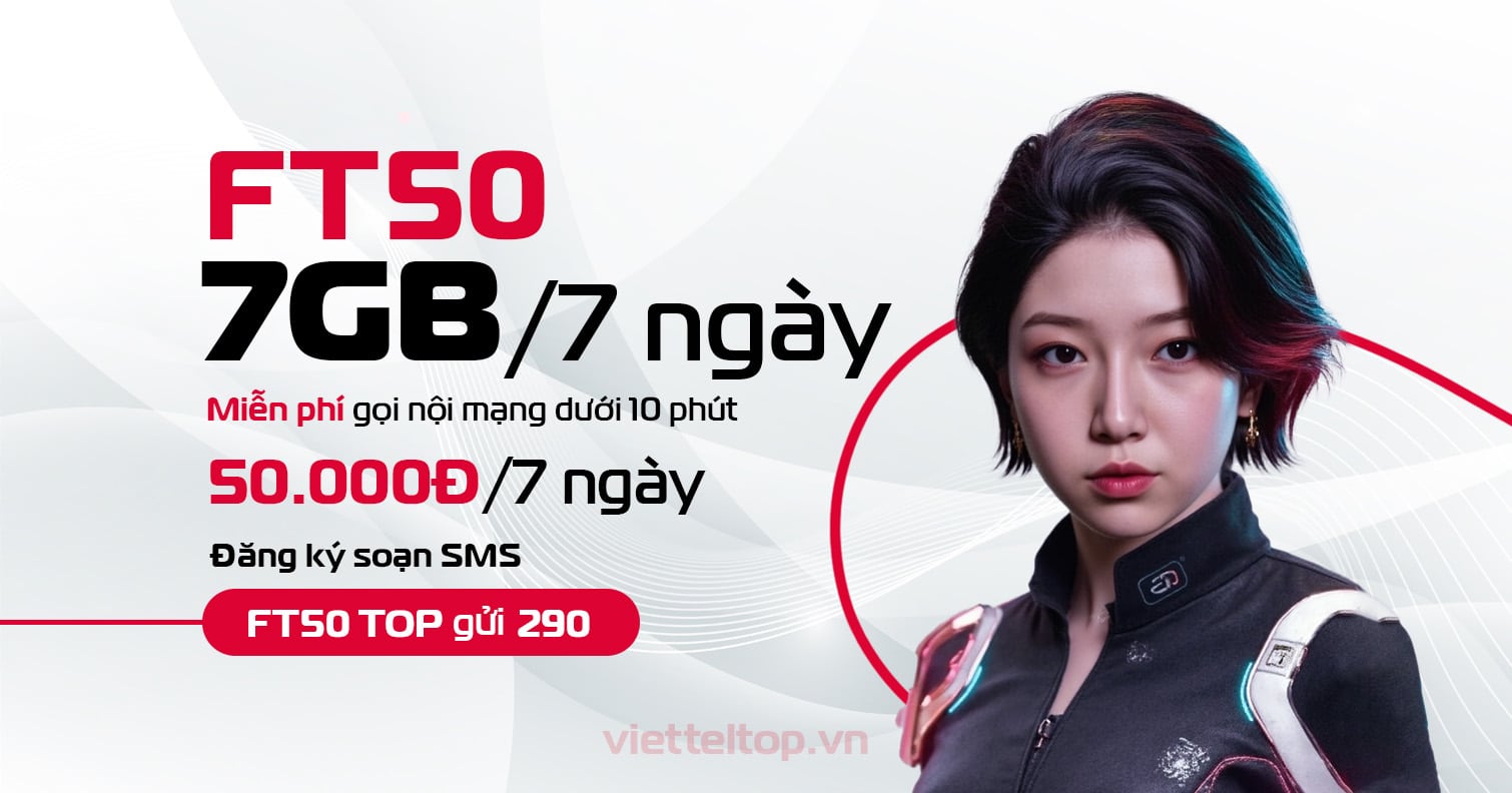 Bạn đang tìm kiếm một gói cước 4G giá rẻ, dung lượng data dồi dào và ưu đãi nghe gọi hấp dẫn? FT50 Viettel chính là lựa chọn lý tưởng. Chỉ với 50.000đ/7 ngày, người dùng sẽ có ngay 7GB data (1GB/ngày) cùng ưu đãi miễn phí cuộc gọi nội mạng dưới 10 phút.