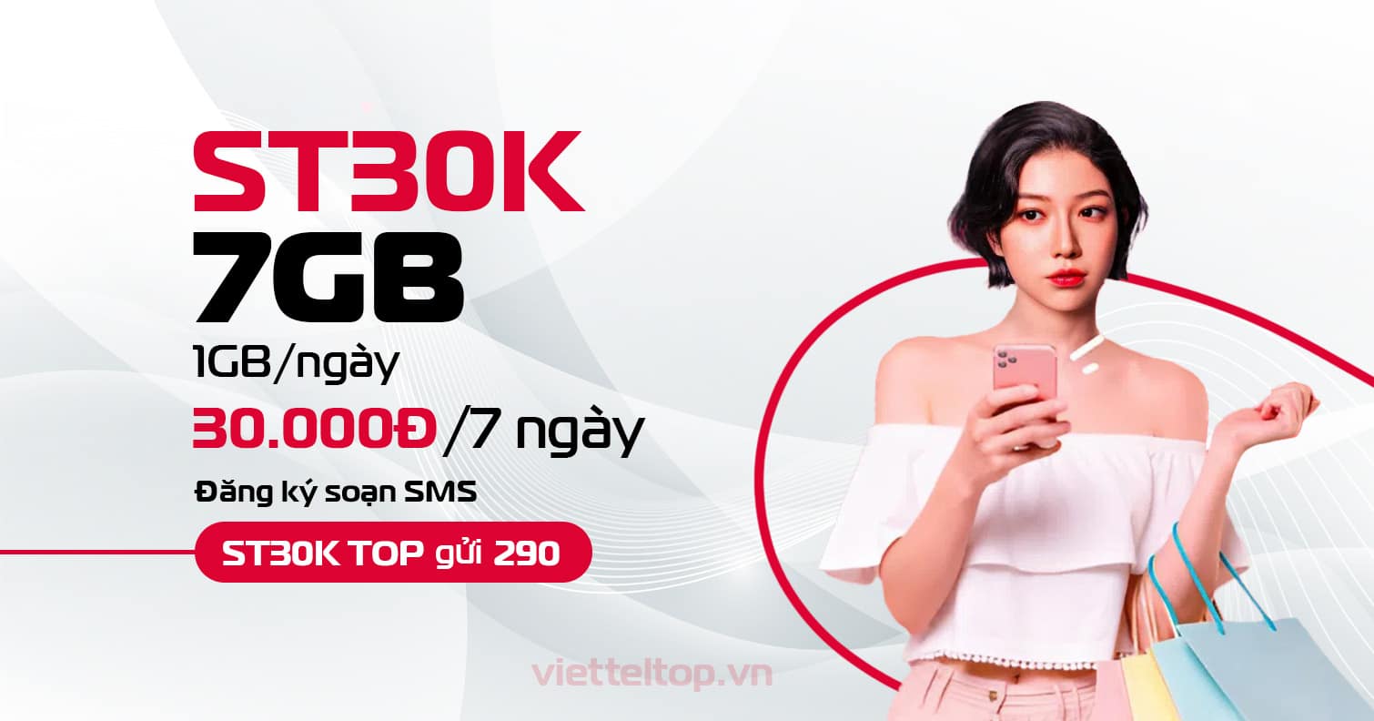 Gói ST30K Viettel là lựa chọn lý tưởng cho những ai cần gói cước 4G giá rẻ, dung lượng ổn định, sử dụng hàng tuần. Chỉ với 30.000đ, bạn có ngay 7GB tốc độ cao, tha hồ giải trí, học tập và làm việc trực tuyến mà không lo gián đoạn.