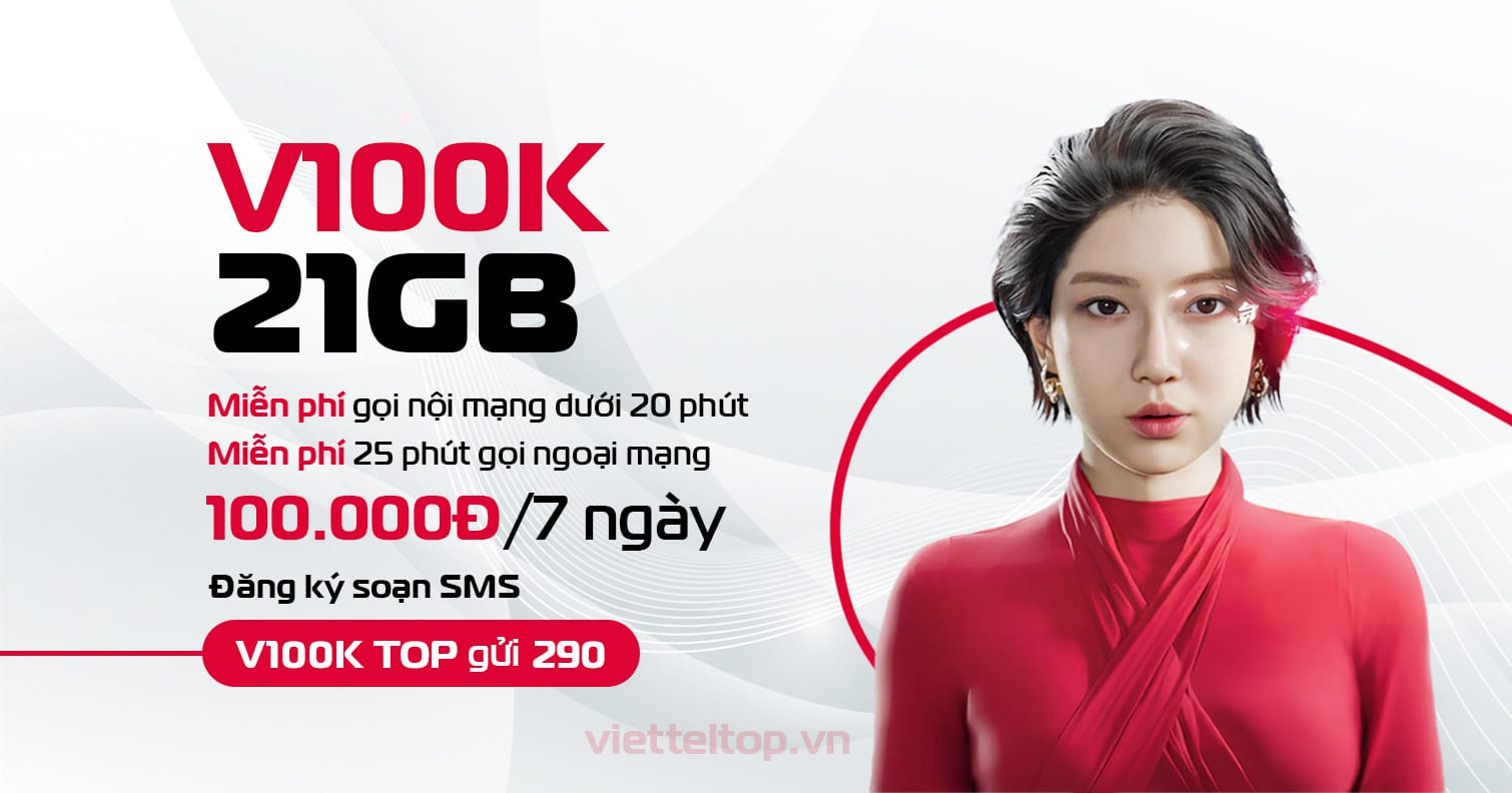 Nếu bạn đang tìm một gói 4G vừa có dung lượng lớn, vừa kèm ưu đãi thoại hấp dẫn, thì V100K Viettel chính là lựa chọn lý tưởng. Chỉ với 100.000đ/7 ngày, thuê bao nhận ngay 21GB data tốc độ cao (3GB/ngày), miễn phí hàng nghìn phút gọi nội mạng và 25 phút gọi ngoại mạng.